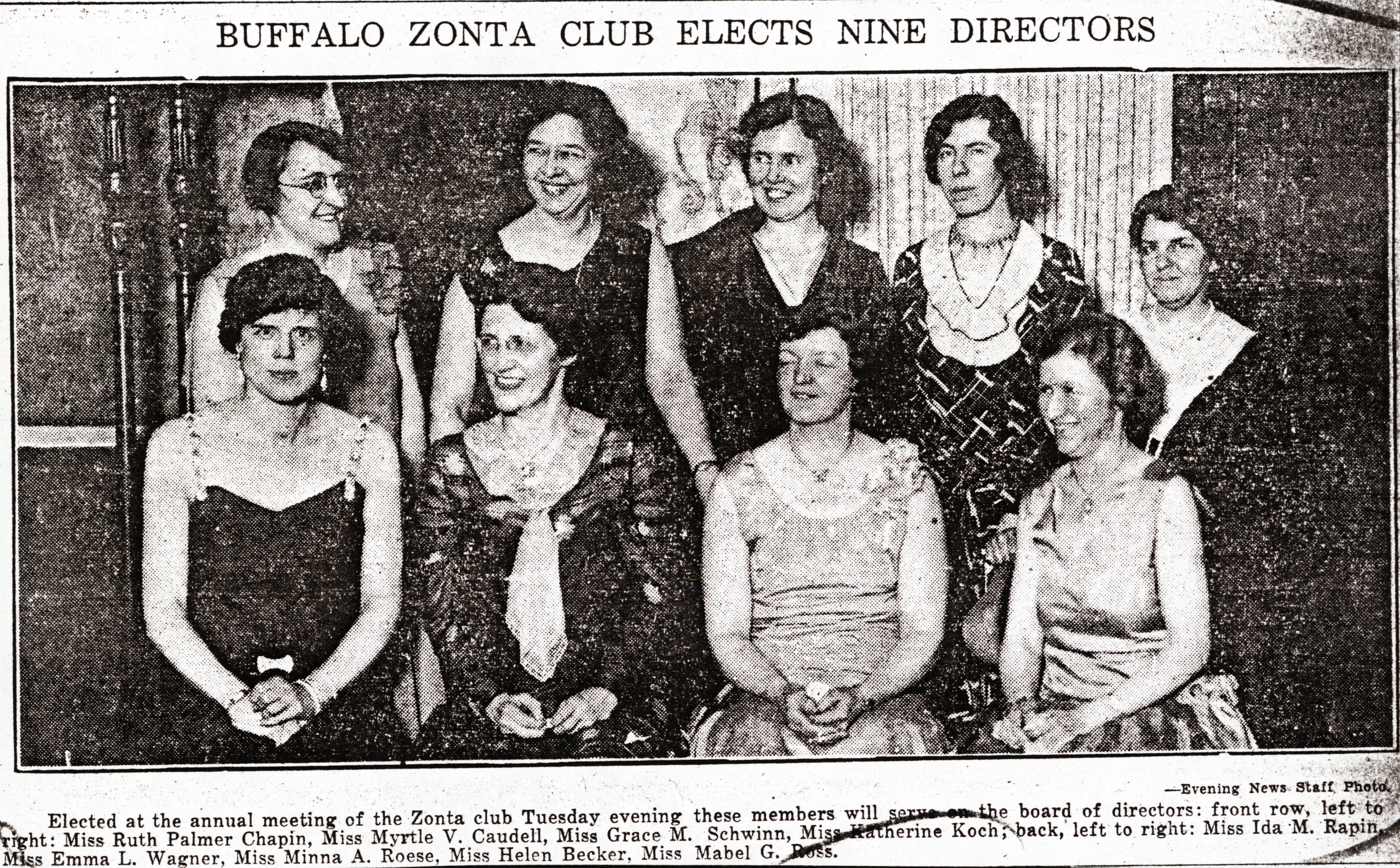Nine Buffalo Zonta Directors elected for 1930-1931 were (seated, left to right): Ruth Palmer Chapin, Myrtle V. Caudell, Grace W. Schwinn, Katherine Koch