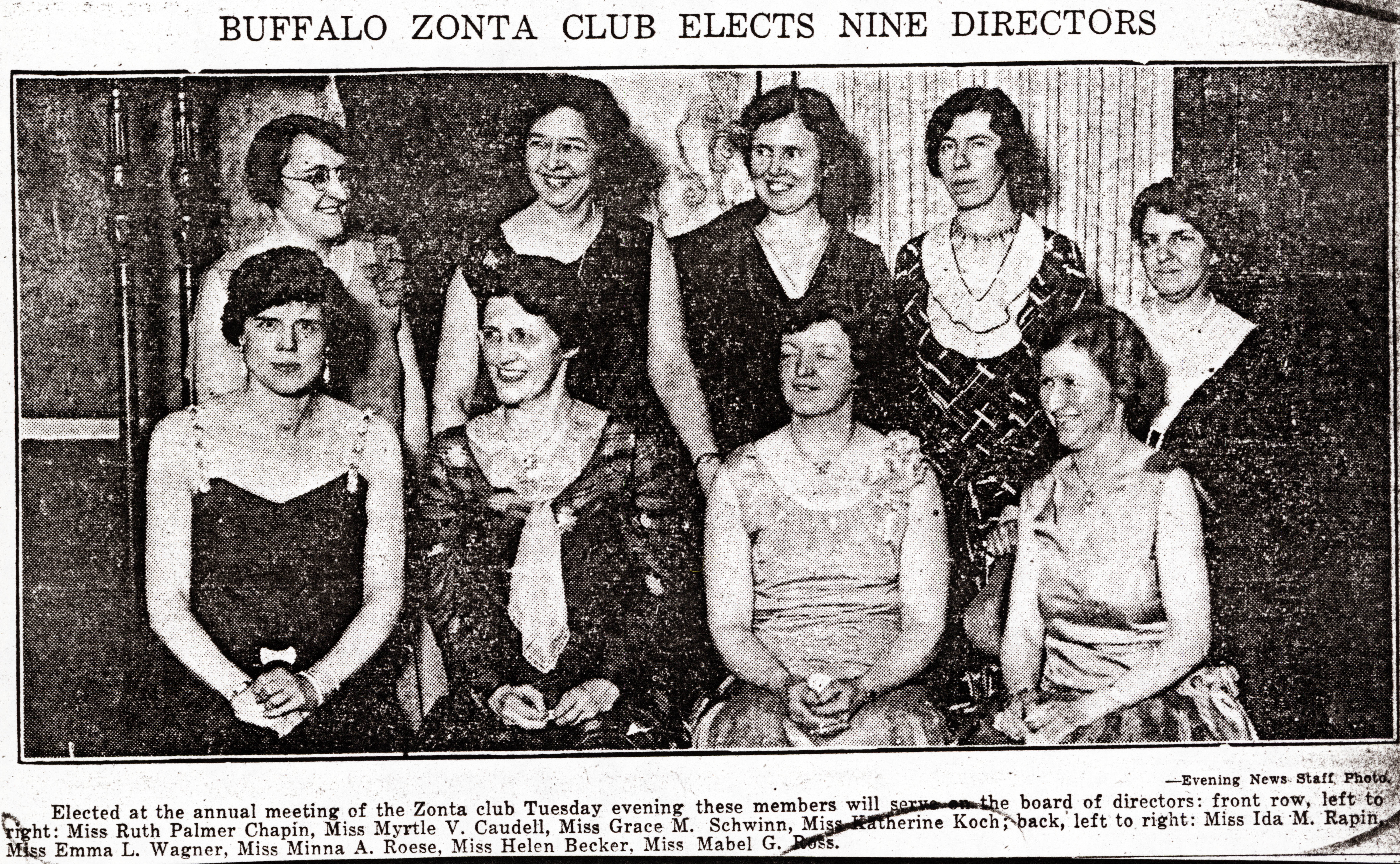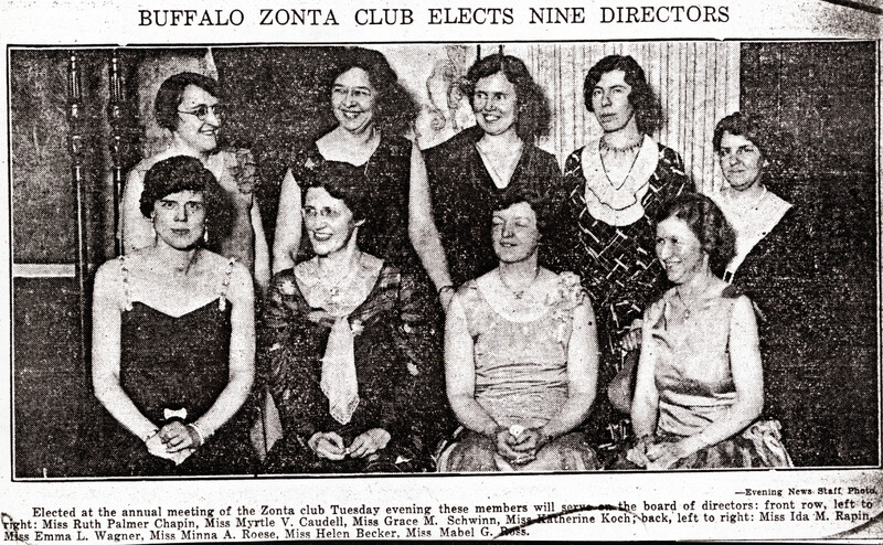 Buffalo Zonta elected nine new members to its directorial board for 1930-1931 including (seated, left to right): Ruth Palmer Chapin, Myrtle V. Caudell, M. Grace Schwinn, Katherine Koch and (standing, left to right): Ida M. Rapin, Emma L. Wagner, Minna A. Roese, Helen Becker and Mabel G. Doss