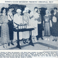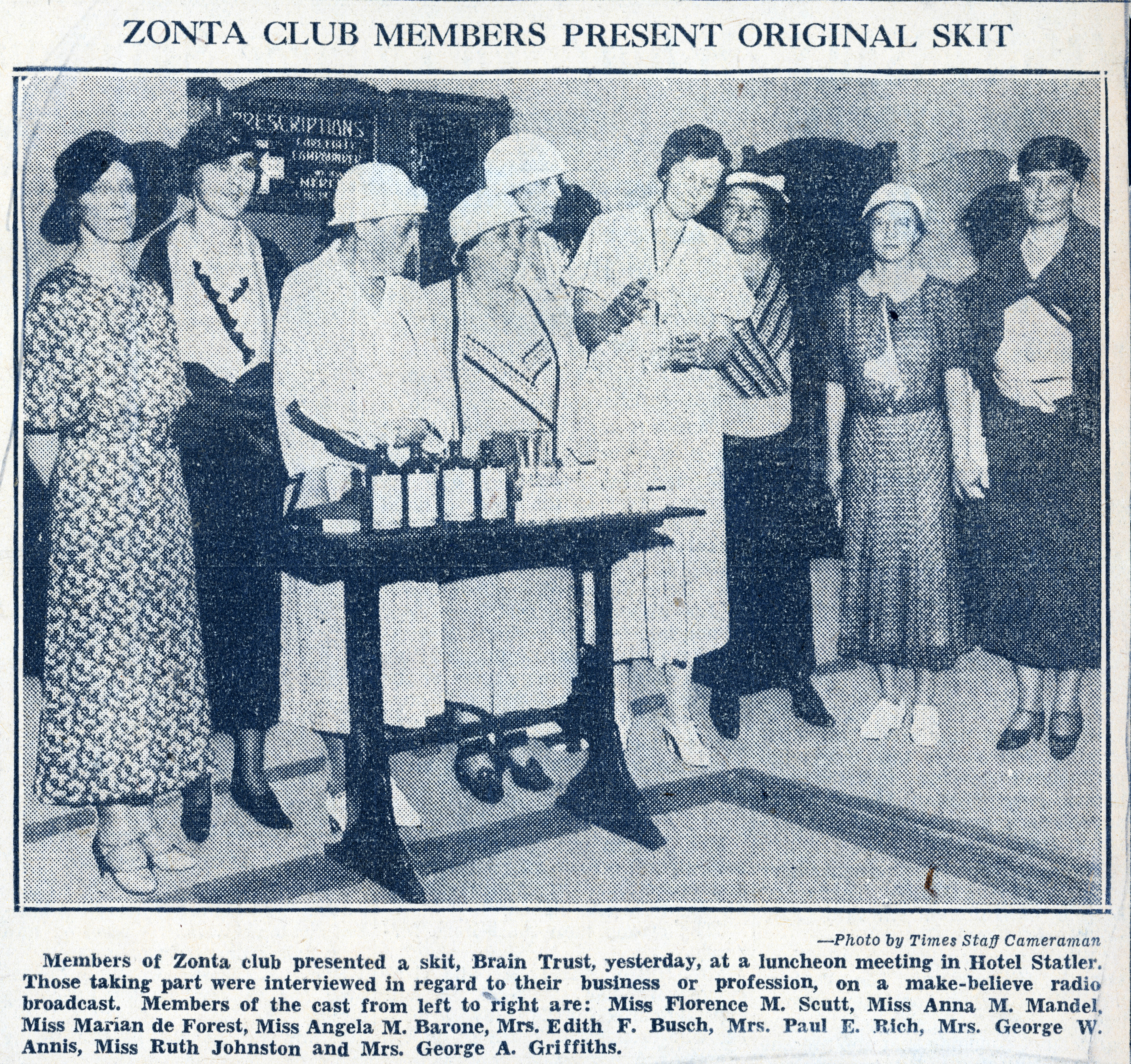 Marian de Forest and fellow Zontians present a make-believe radio broadcast skit 'Brain Trust' at a Hotel Statler luncheon meeting