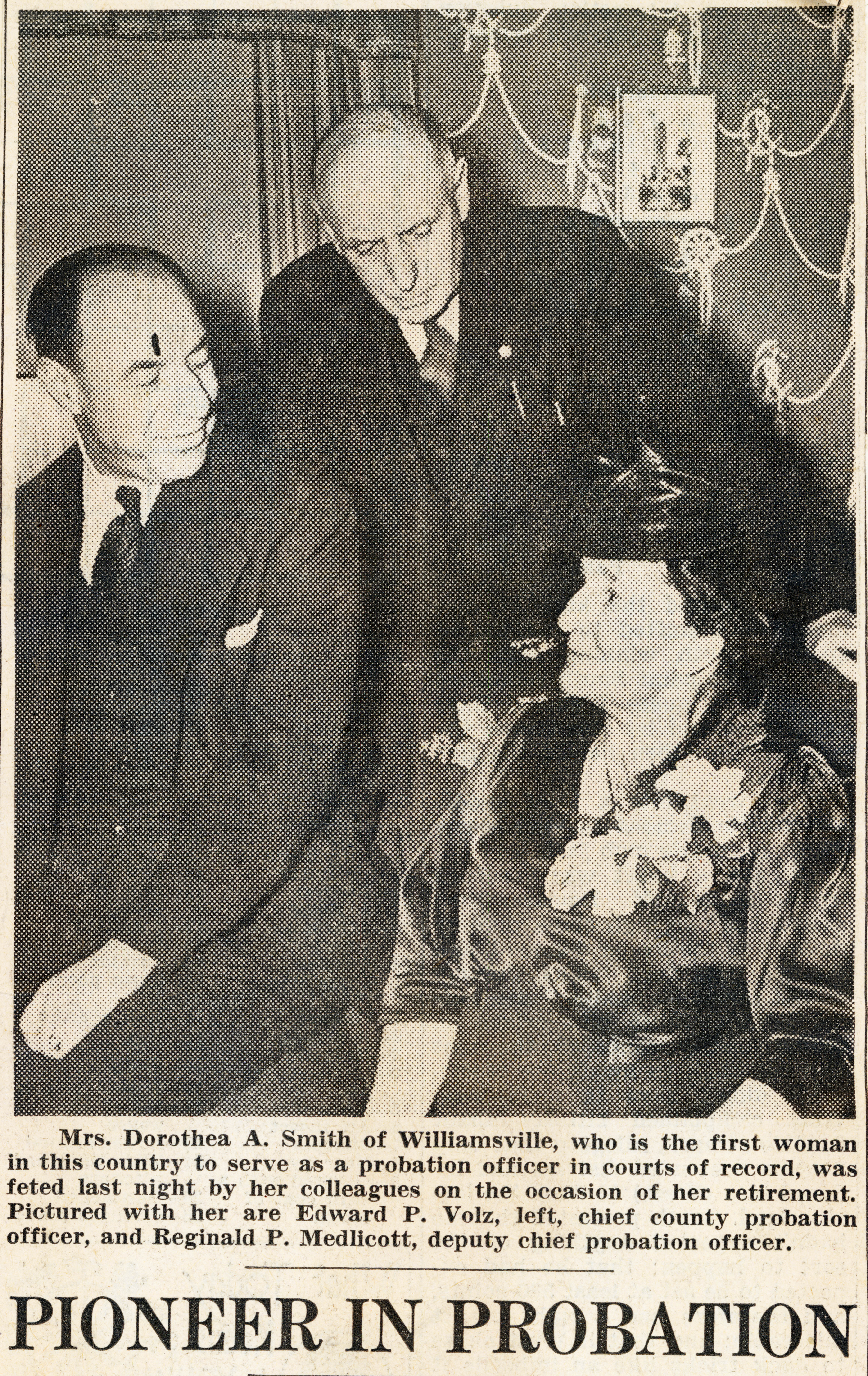 - Long-time Buffalo Zontian Mrs. Dorothea A. Smith was the first woman in the United States to serve as a probation officer in courts of record. Honoring her in retirement are (left to right): Chief County Probation Officer Edward P. Volz and Deputy Chief Probation Officer Reginald P. Medlicott