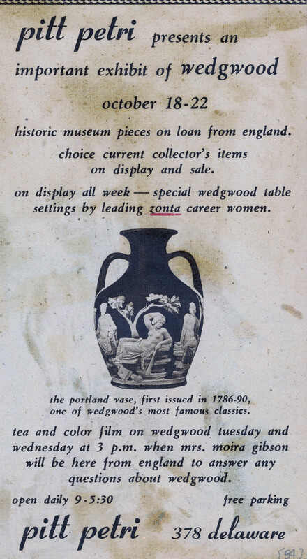 - Pitt Petri advertisement for an exhibit of Wedgwood china settings designed by leading Zonta career women