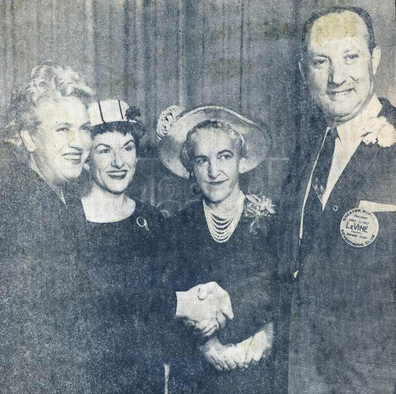 Buffalo Zontian Statler Hilton March 17, 1959 luncheon included (left to right): honoree Jacqueline Cochran, luncheon chairman Martha Torge, Buffalo Zonta president Mrs. Andrew (Mary S.) Switzer and Ad Club president Ivan Levine