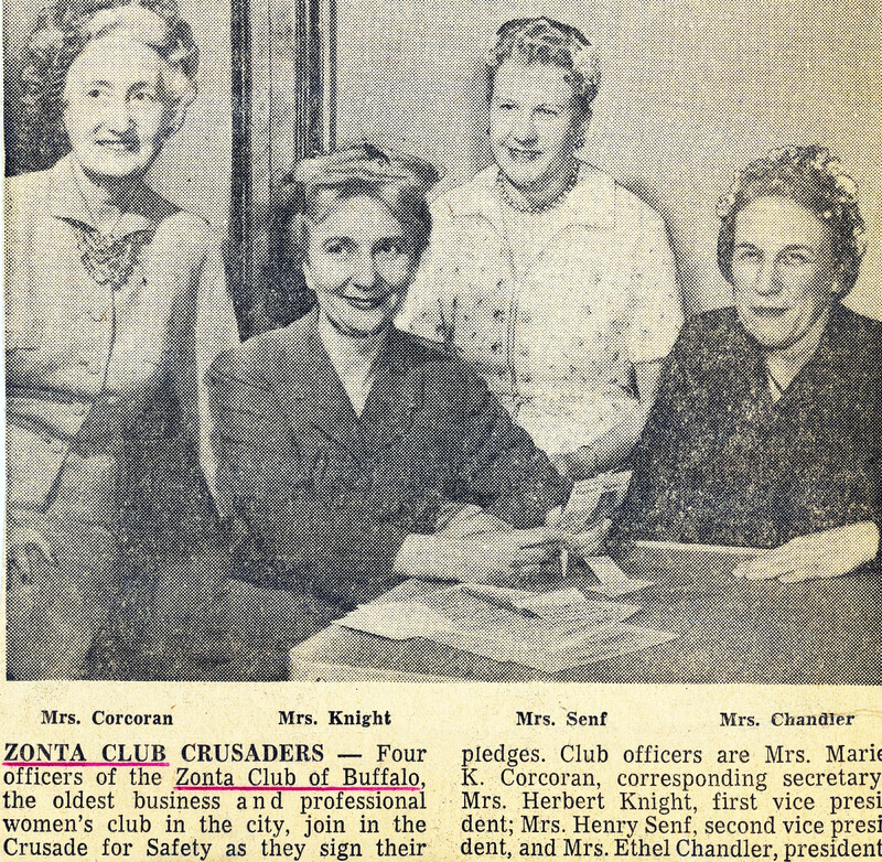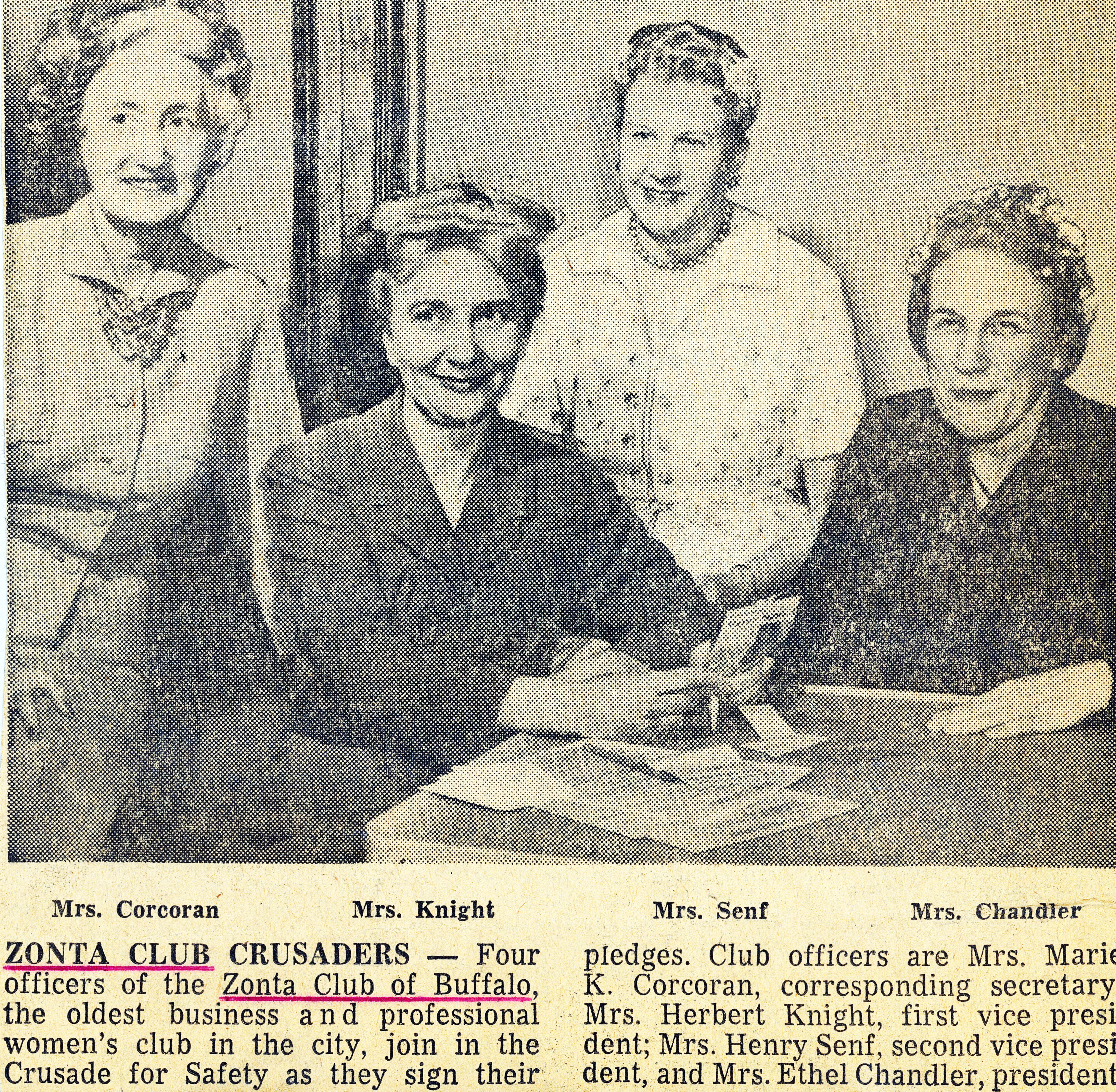 Buffalo Zonta officers concerned with safety include (left to right): Secretary Mrs. Marie K. Corcoran, First vice president Mrs. Herbert (Ella) Knight, Second vice president Mrs. Henry (Betty L.) Senf and President Mrs. Ethel M. Chandler