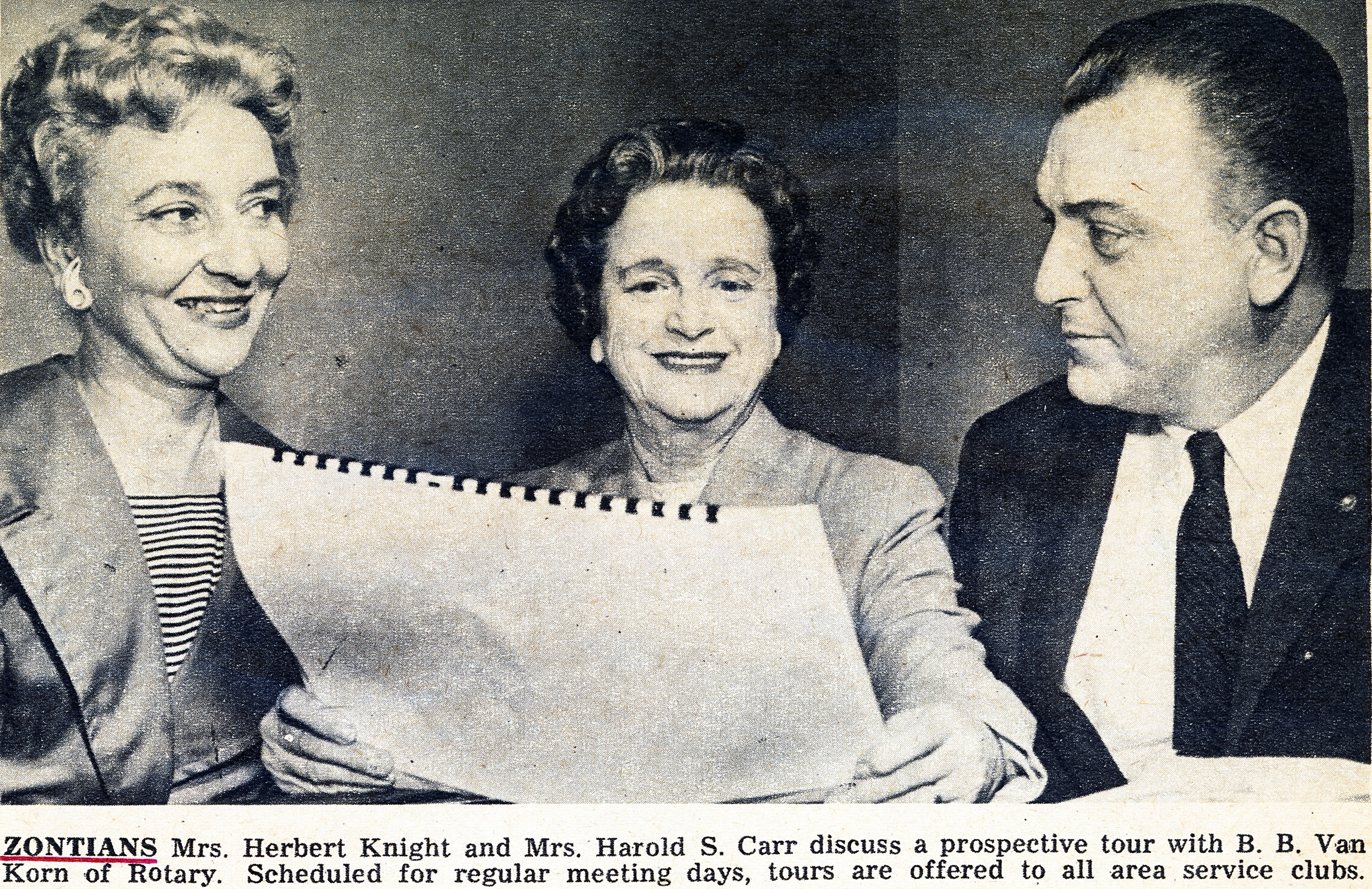 Buffalo Zontians Mrs. Herbert (Ella) Knight (left) and Mrs. Harold S. Carr plan a prospective tour with B. B. Van Korn of the Rotary as part of Zonta's program of community service