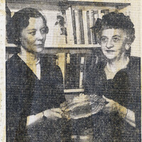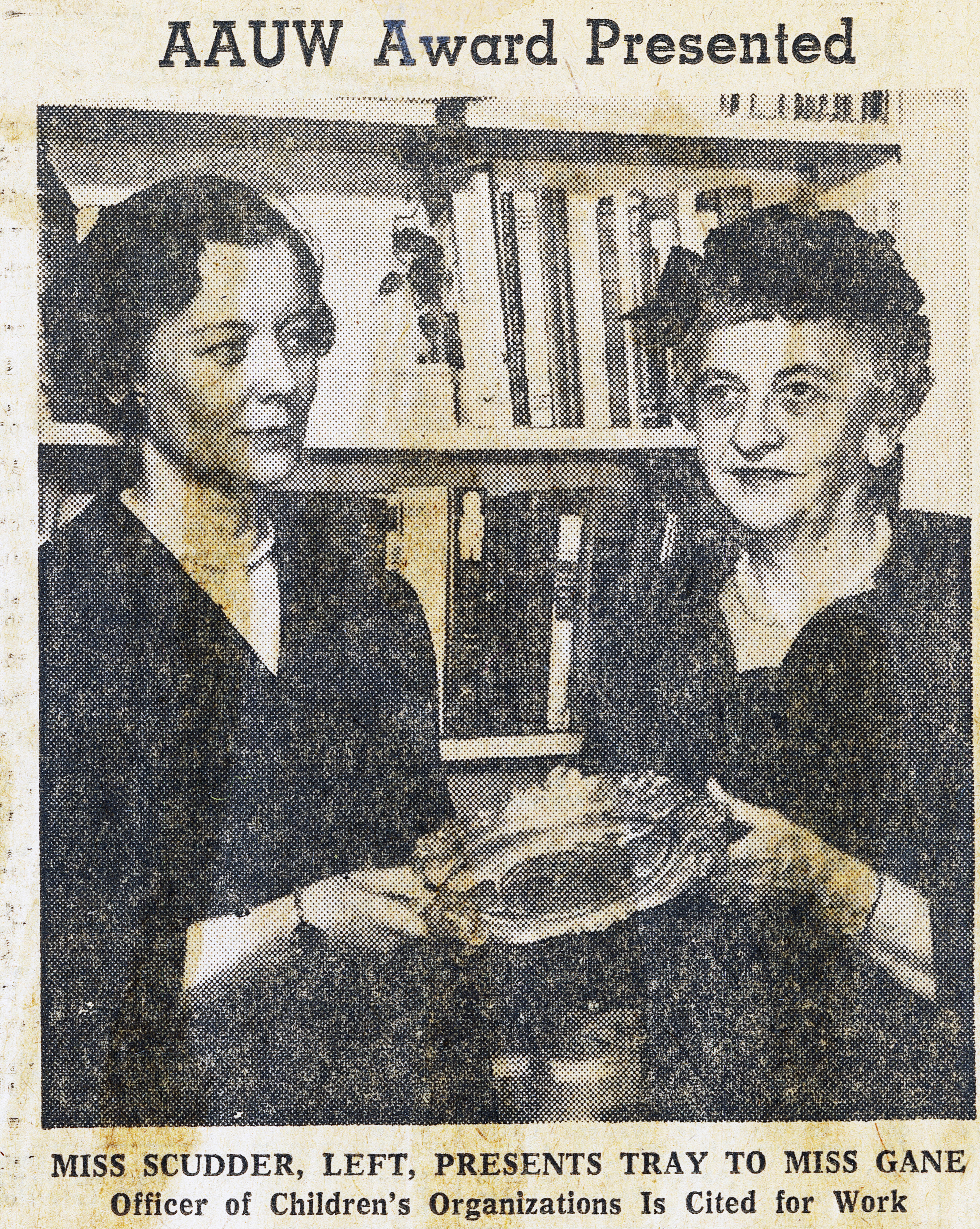 - E. Marguerite Gane (right), a longtime Zontian and executive secretary of Children's Aid and Society for the Prevention of Cruelty to Children is presented with her award by the branch president Miss Jeannette Scudder (left) for her good works.