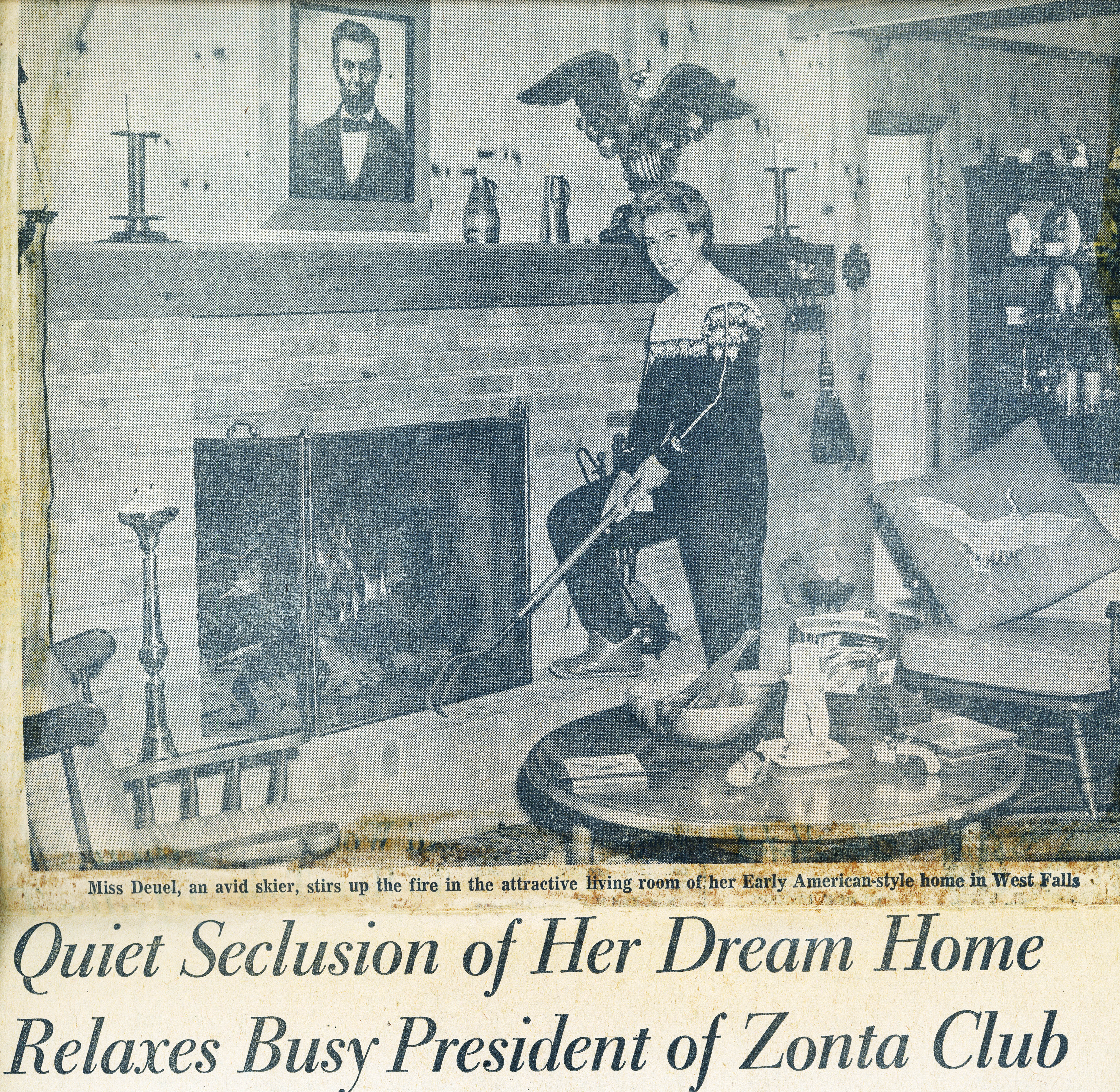 - Avid skier and President of Buffalo Zonta Miss Virginia Deuel stirring the fire in the living rooms of her Earlty American style home in West Falls, New York
