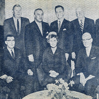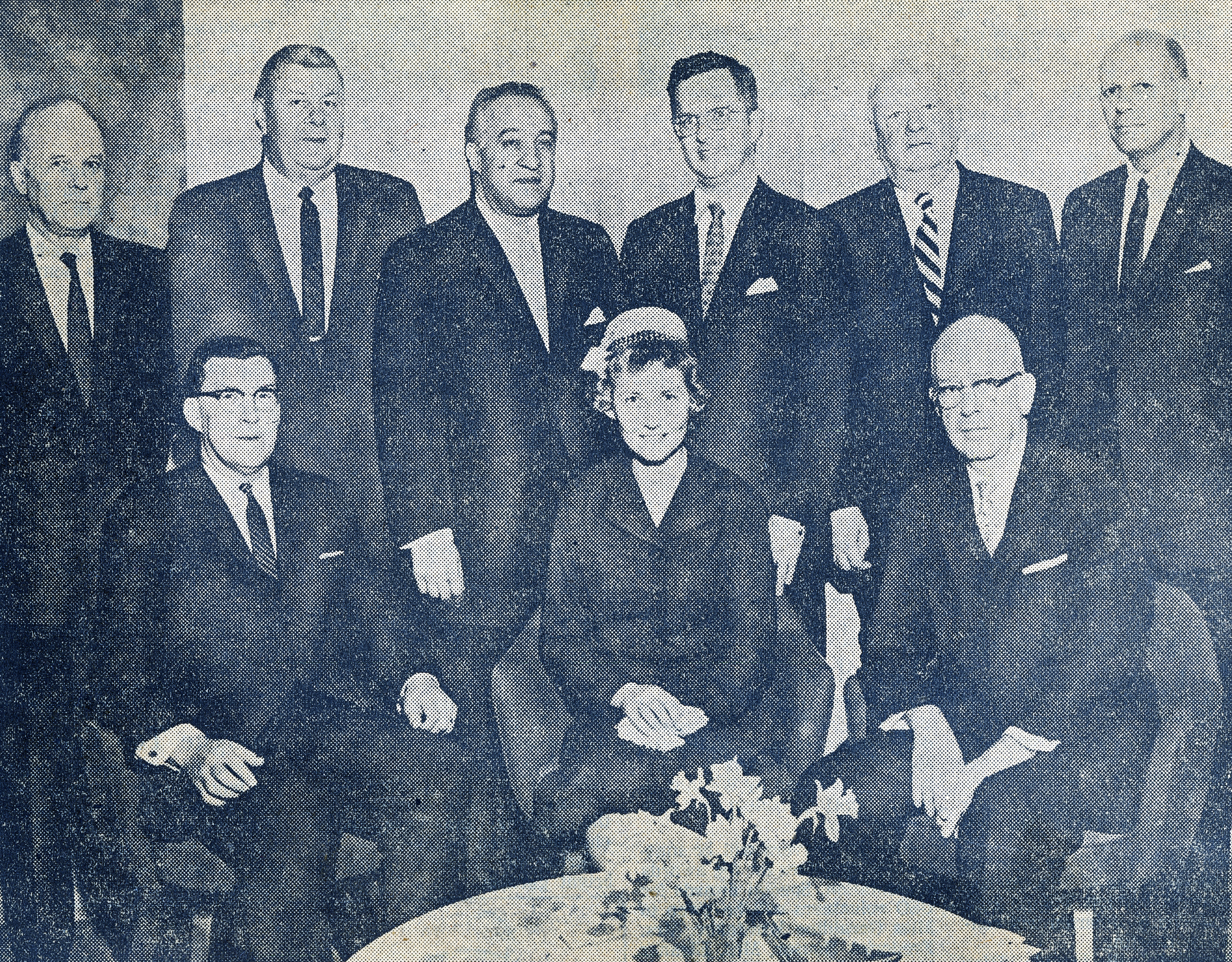 (standing, left to right): Robert H. Westphall, William C. Cudmore, Dr. Joseph Manch, Peter C. Andrews, Daniel B. Niederlander and William H. Schuman.