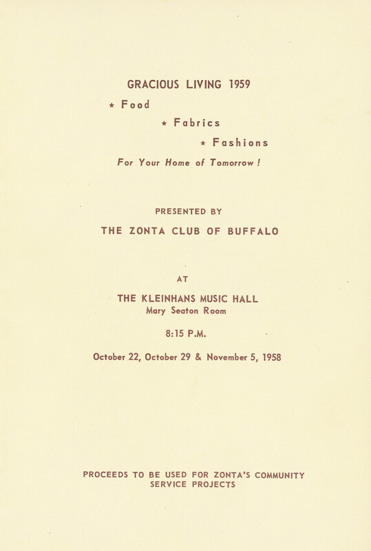 - Buffalo Zonta's Gracious Living 1959 program featured the latest in food, fabrics and fashions for the home of tomorrow
