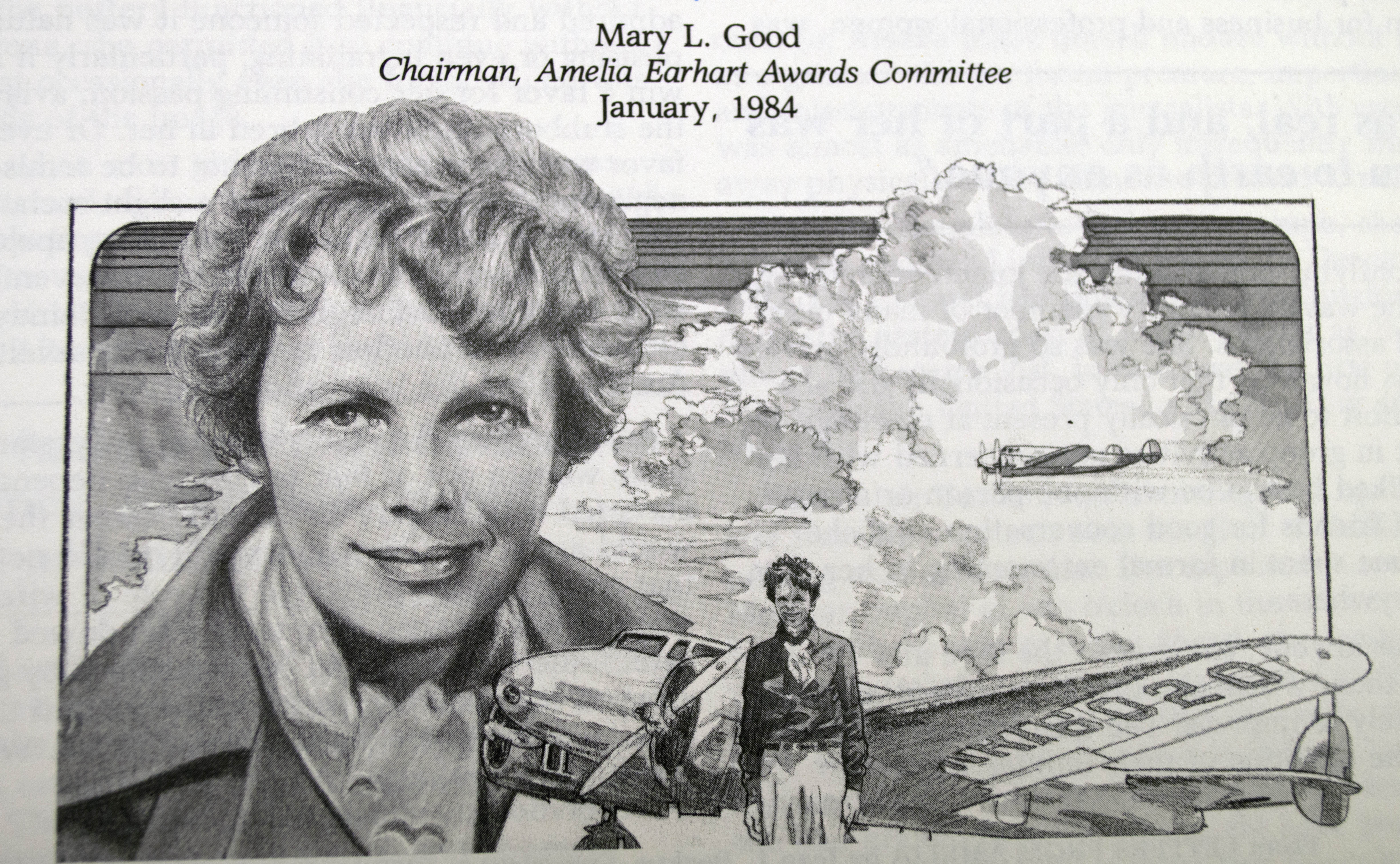- Famed aviatrix Amelia Earhart decorates notepaper which was designed as a scholarship fund-raiser by Mary L. Good, Chairman, Amelia Earhart Awards Committee 1984