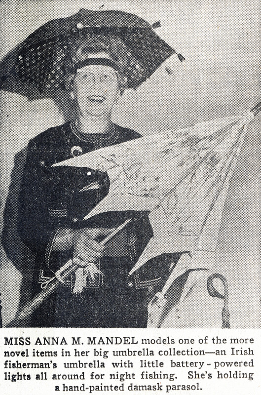 - Long-time Buffalo Zontian Miss Anna M. Mandel, an umbrella manufacturer, also maintained an extensive collection of unusual and unique umbrellas including (pictured here) an Irish fisherman's umbrella with battery-powered lights all around for night fishing.