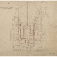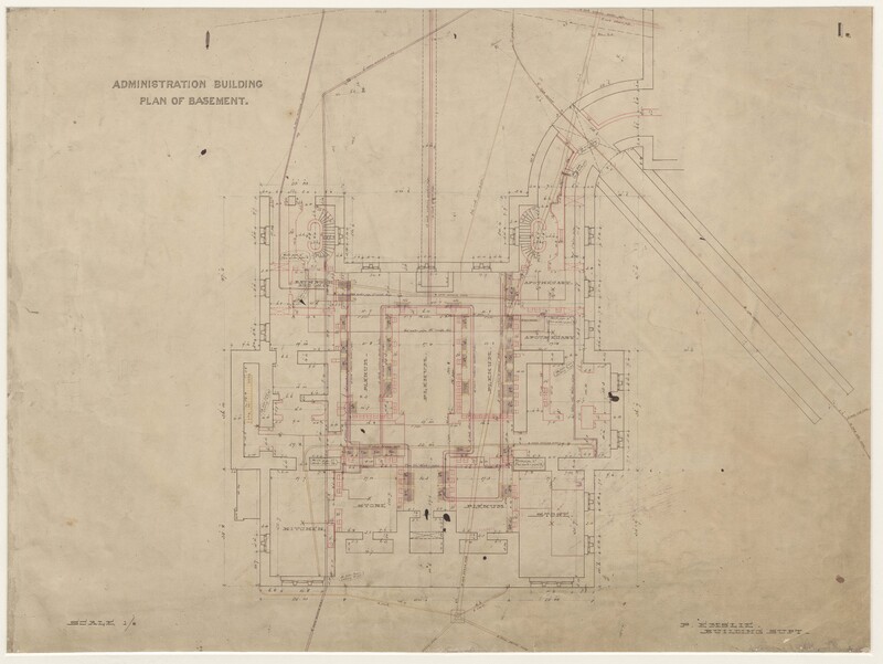 - Digital image of drawing #1 from H. H. Richardson's plans for the Buffalo State Asylum for the Insane, as reproduced by Peter Emslie, the Asylum’s Supervising Architect (1877-1880) and Building Superintendent (1878-1880) in pencil and ink. Includes plan for the basement of the Administration Building, 1880