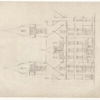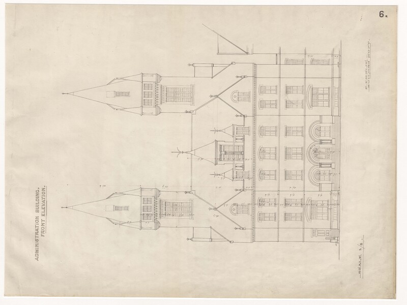 - Digital image of drawing #6 from H. H. Richardson's plans for the Buffalo State Asylum for the Insane, as reproduced by Peter Emslie, the Asylum’s Supervising Architect (1877-1880) and Building Superintendent (1878-1880) in pencil and ink. Includes drawing of the front elevation of the Administration Building, 1880
