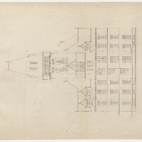 - Digital image of drawing of the west elevation of the Administration Building from H. H. Richardson's plans for the Buffalo State Asylum for the Insane, as reproduced by Peter Emslie, the Asylum’s Supervising Architect (1877-1880) and Building Superintendent (1878-1880) in pencil and ink, 1880