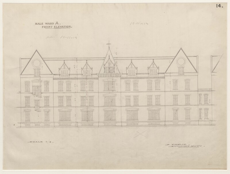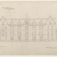 - Digital image of drawing #14 from H. H. Richardson's plans for the Buffalo State Asylum for the Insane, as reproduced by Peter Emslie, the Asylum’s Supervising Architect (1877-1880) and Building Superintendent (1878-1880) in pencil and ink, 1880. Drawing of front elevation of Male Ward A.
