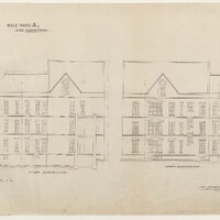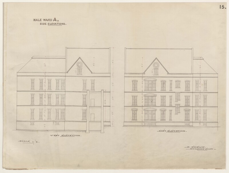 - Digital image of drawing #15 from H. H. Richardson's plans for the Buffalo State Asylum for the Insane, as reproduced by Peter Emslie, the Asylum’s Supervising Architect (1877-1880) and Building Superintendent (1878-1880) in pencil and ink, 1880. Drawing of side elevations of Male Ward A.