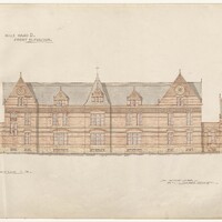 - Digital image of drawing #33 from H. H. Richardson's plans for the Buffalo State Asylum for the Insane, as reproduced by Peter Emslie, the Asylum’s Supervising Architect (1877-1880) and Building Superintendent (1878-1880) in pencil, ink, and watercolor, 1880. Drawing of front elevation of Male Ward D.