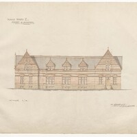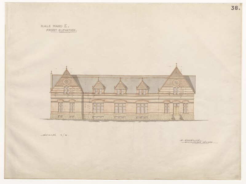 - Digital image of drawing #38 from H. H. Richardson's plans for the Buffalo State Asylum for the Insane, as reproduced by Peter Emslie, the Asylum’s Supervising Architect (1877-1880) and Building Superintendent (1878-1880) in pencil, ink, and watercolor, 1880. Drawing of front elevation of Male Ward E.