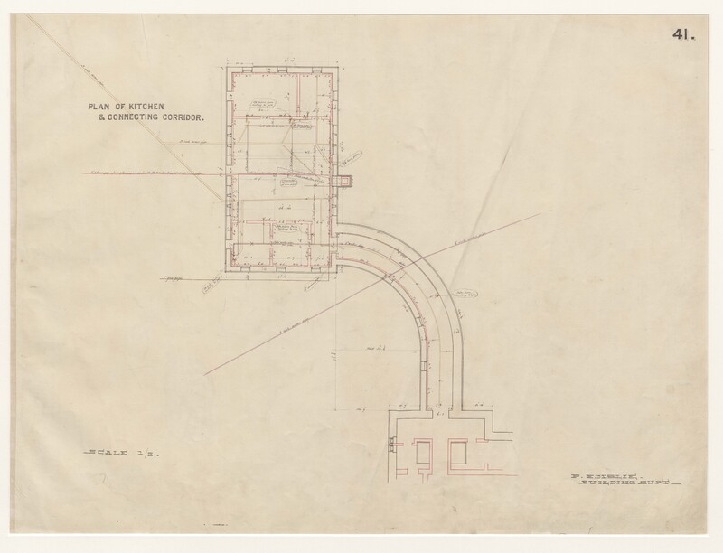 - Digital image of drawing #41 from H. H. Richardson's plans for the Buffalo State Asylum for the Insane, as reproduced by Peter Emslie, the Asylum’s Supervising Architect (1877-1880) and Building Superintendent (1878-1880) in pencil and ink, 1880. Drawing of the kitchen for the wards and a connecting corridor.
