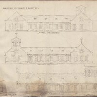 - Digital image of drawing #44 from H. H. Richardson's plans for the Buffalo State Asylum for the Insane, as reproduced by Peter Emslie, the Asylum’s Supervising Architect (1877-1880) and Building Superintendent (1878-1880) in pencil and ink, 1880. Drawing of the north, south, and west elevations of the workshop and bakery.