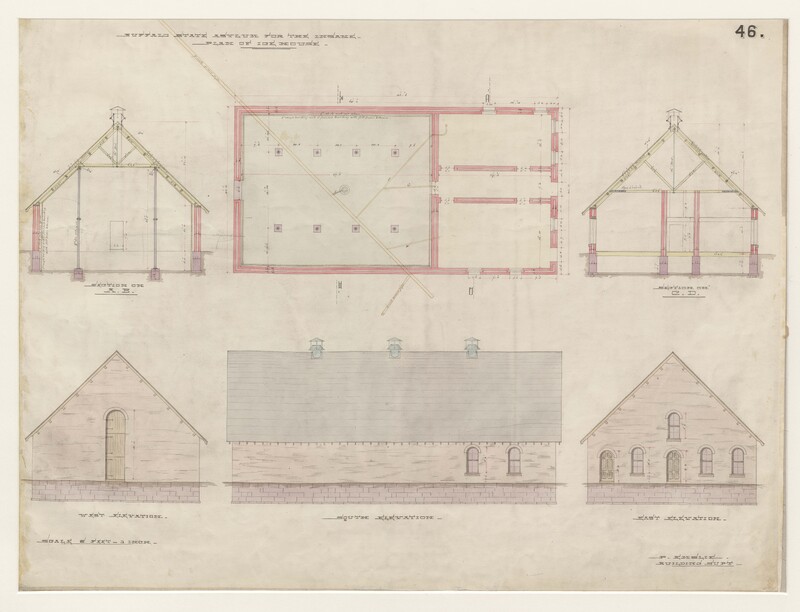 - Digital image of drawing #46 from H. H. Richardson's plans for the Buffalo State Asylum for the Insane, as reproduced by Peter Emslie, the Asylum’s Supervising Architect (1877-1880) and Building Superintendent (1878-1880) in pencil, ink, and watercolor, 1880. Drawings of the ice house.