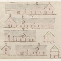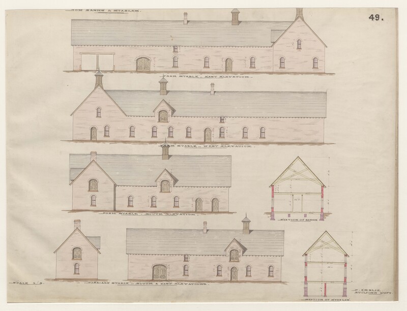- Digital image of drawing #49 from H. H. Richardson's plans for the Buffalo State Asylum for the Insane, as reproduced by Peter Emslie, the Asylum’s Supervising Architect (1877-1880) and Building Superintendent (1878-1880) in pencil, ink, and watercolor, 1880. Drawings of elevations of stables and cow barns.