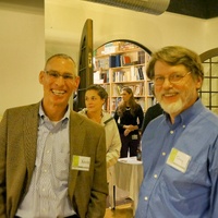 - Two men with name tags smiling at the camera