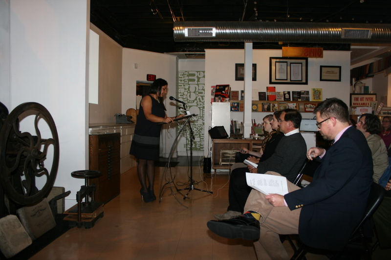 Person standing in front of a microphone with an audience