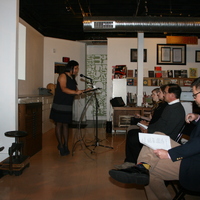 - Person standing in front of a microphone with an audience
