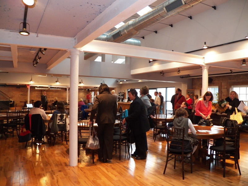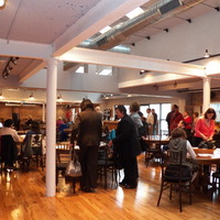 People standing around and sitting at tables, talking