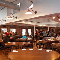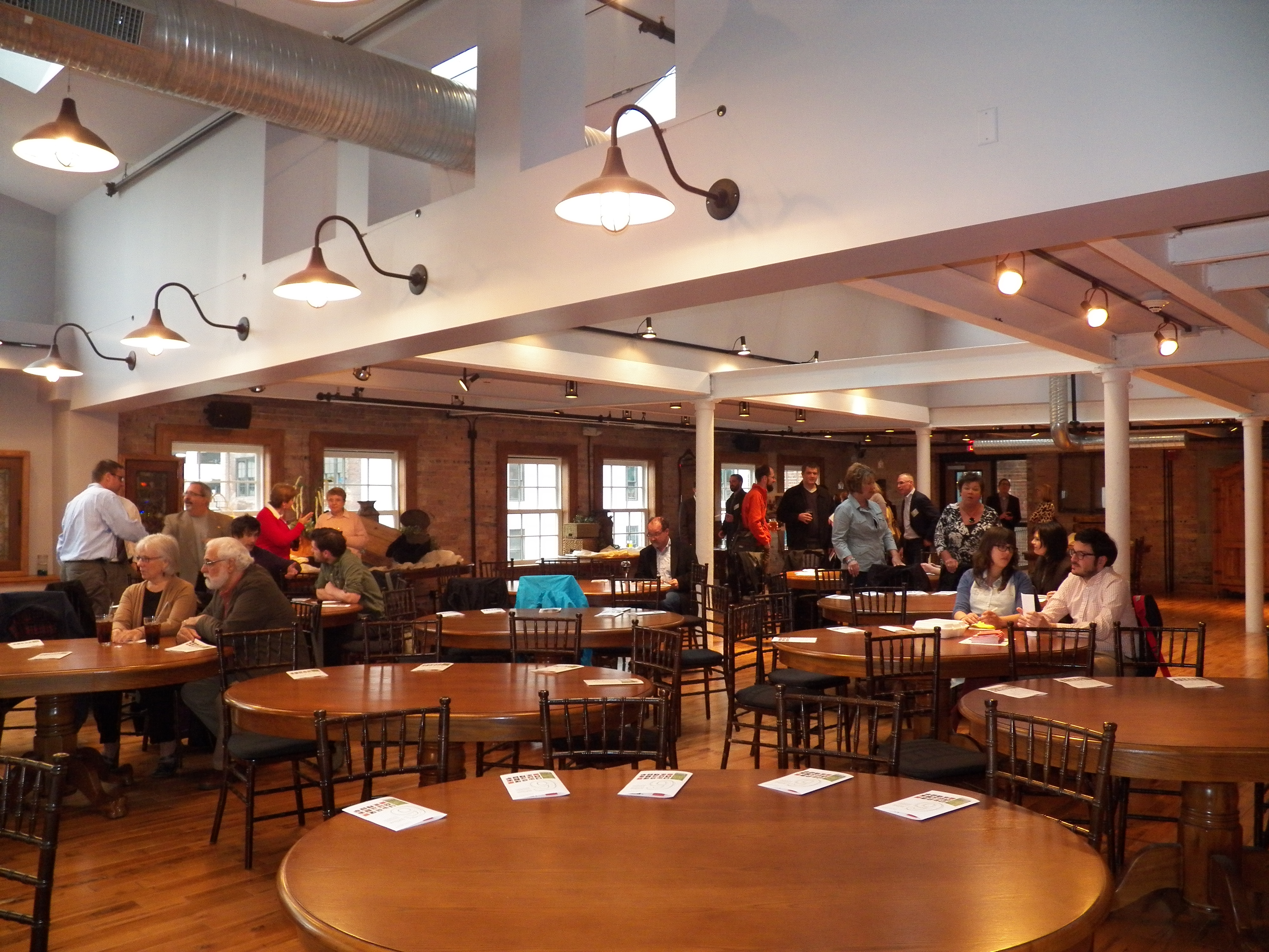 People standing around and sitting at tables, talking. Tables at the front of the picture have no people, but show the 6Mbs programs at the seats.