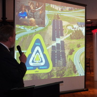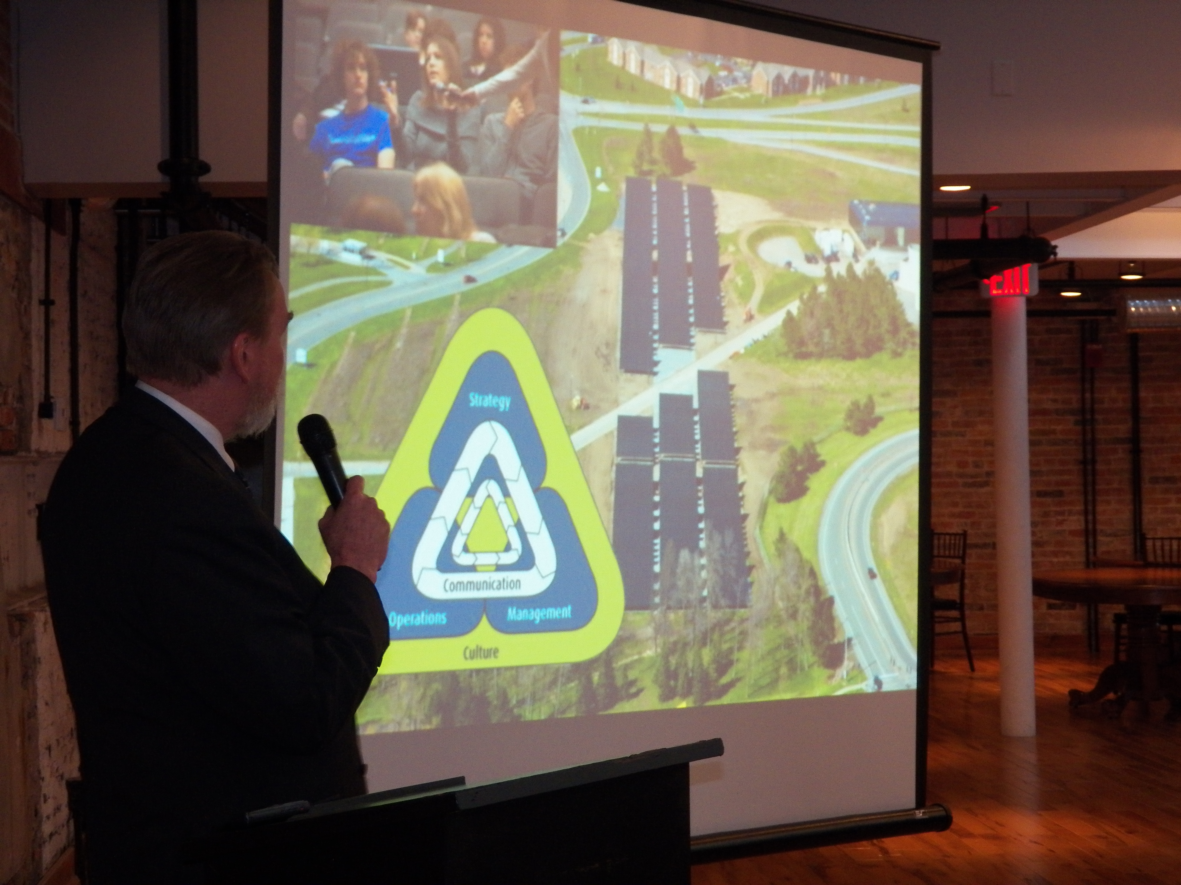 - Person holding a microphone in front of a screen
