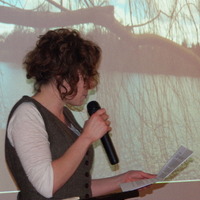 - Person holding a microphone in front of a screen