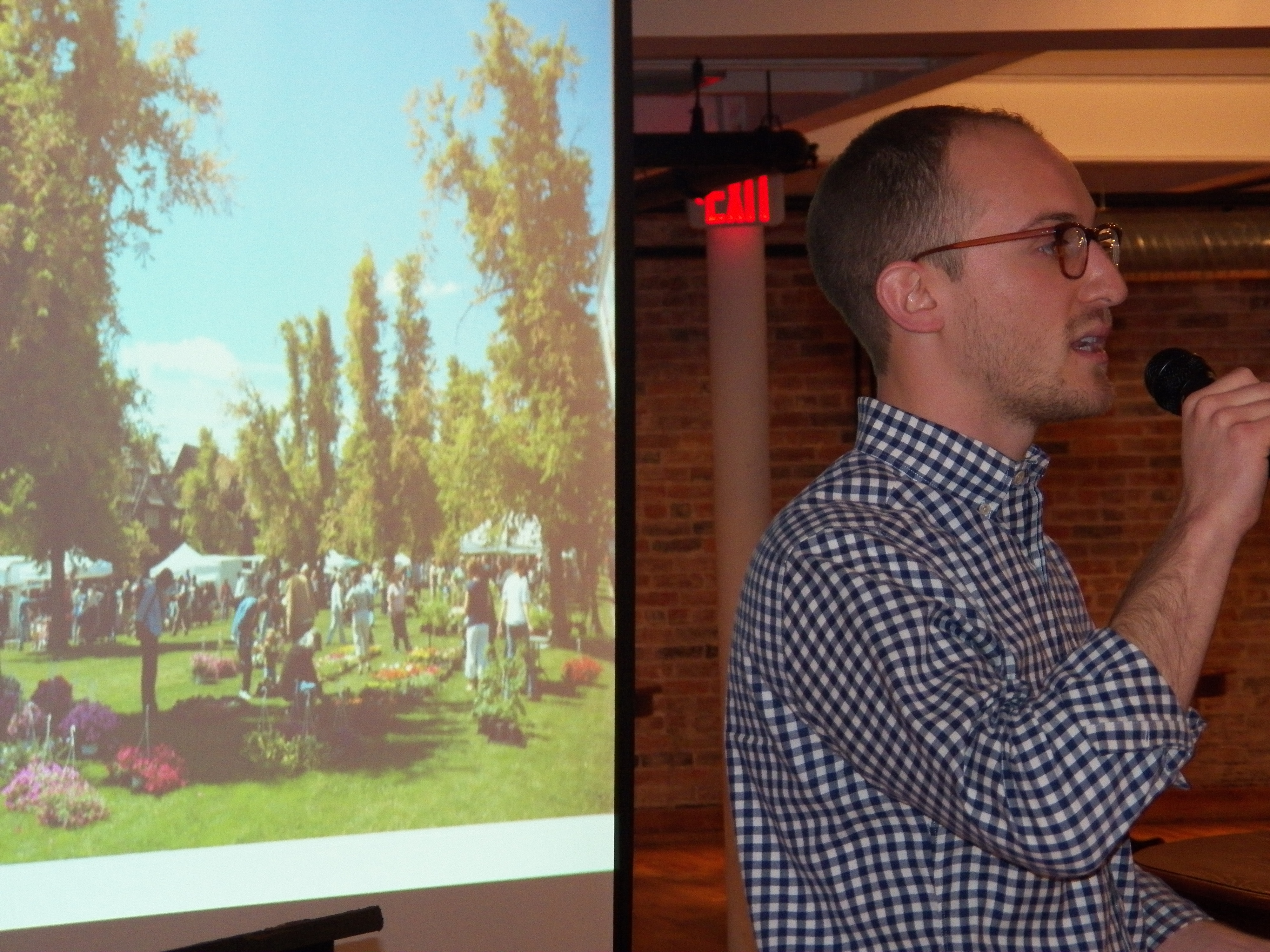 - Person holding a microphone in front of a screen