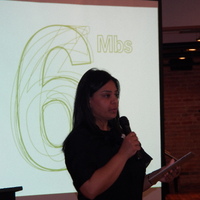 - Person holding a microphone in front of a screen showing the 6Mbs logo