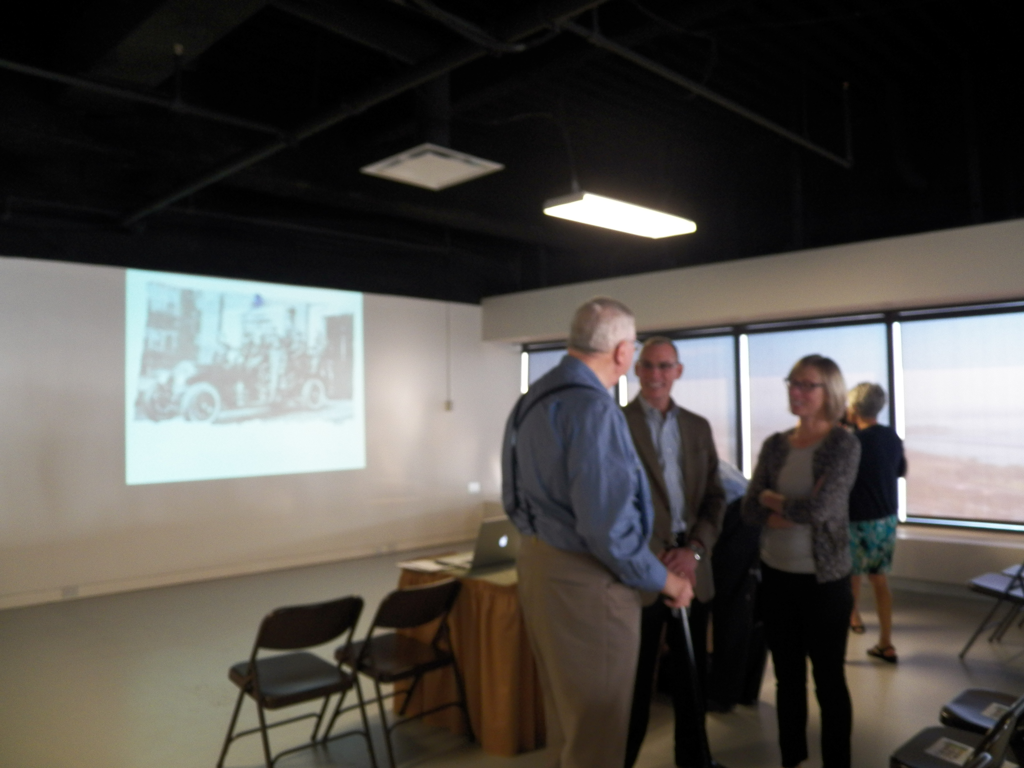 Three people standing in a group and talking