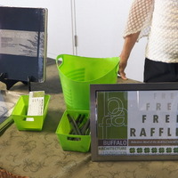 A table with several items on it, including a sign that says "Free Raffle". Part of a person is visible on the other side of the table.