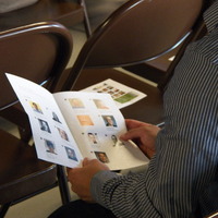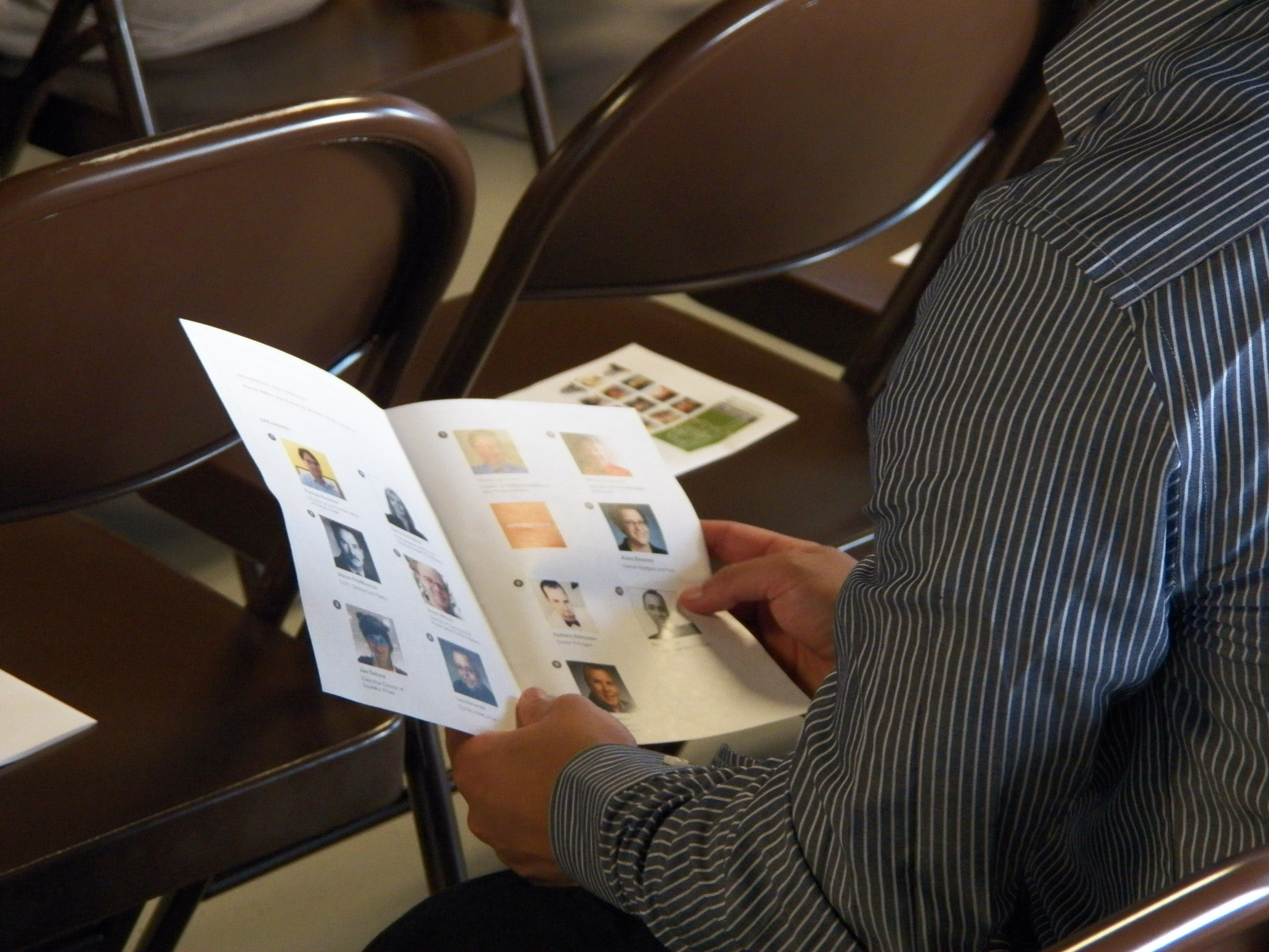 - Person wearing a striped shirt, sitting, holding an open event program.