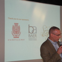 - Person holding a microphone, standing in front of a screen that shows three logos