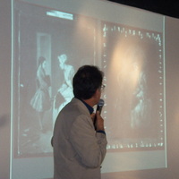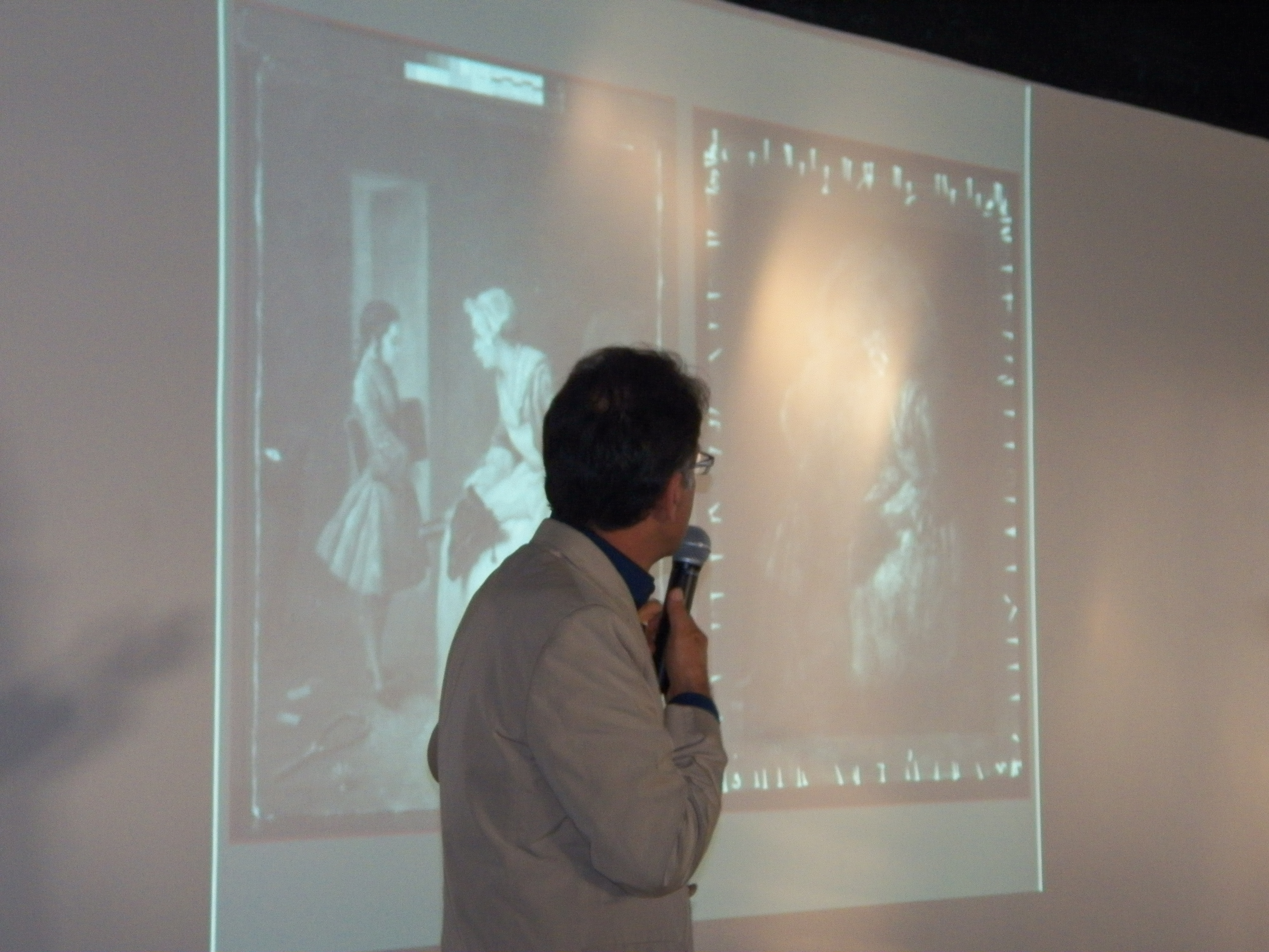 - Person holding a microphone, standing in front of a screen