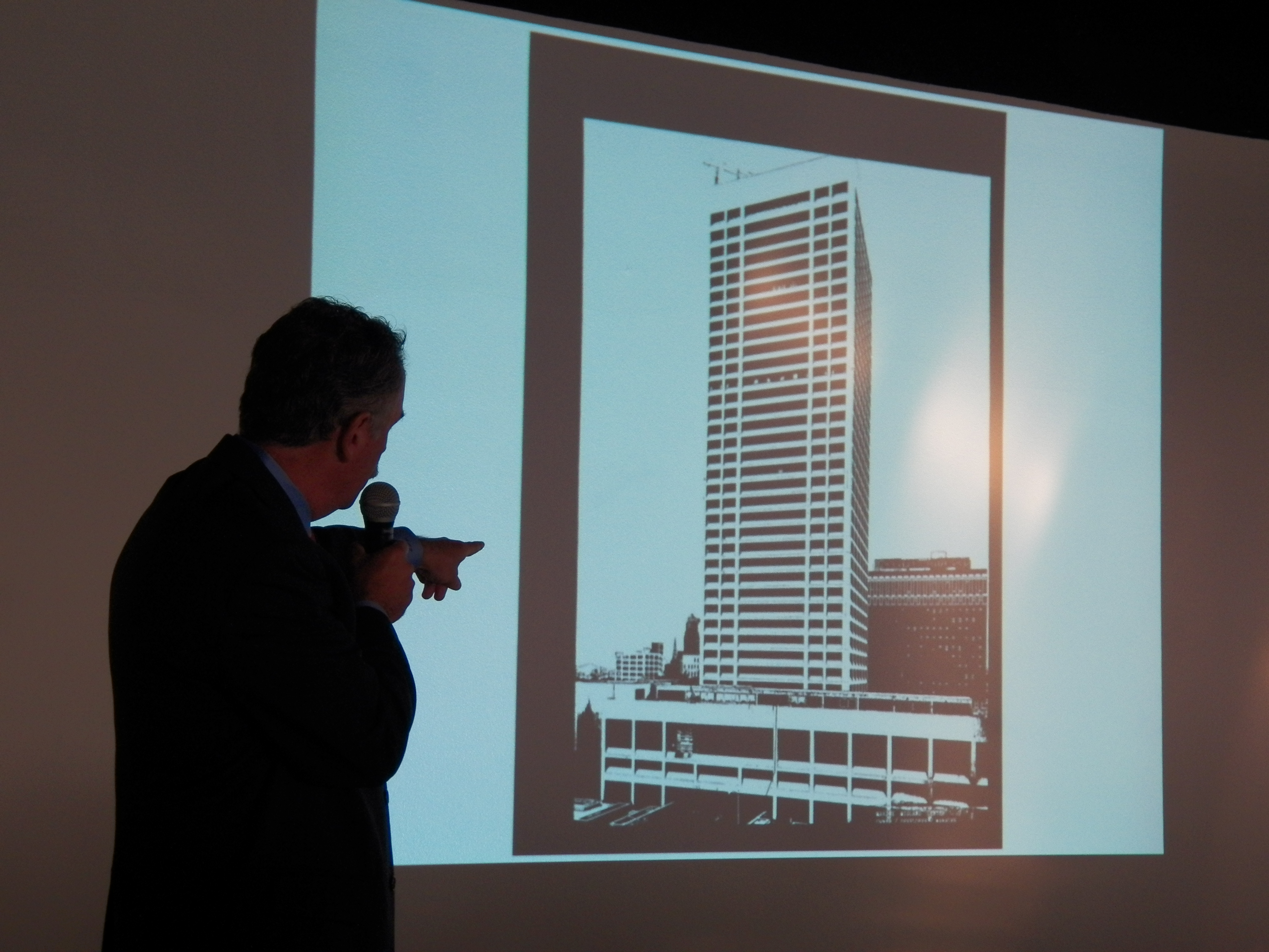 - Person holding a microphone, standing in front of a screen