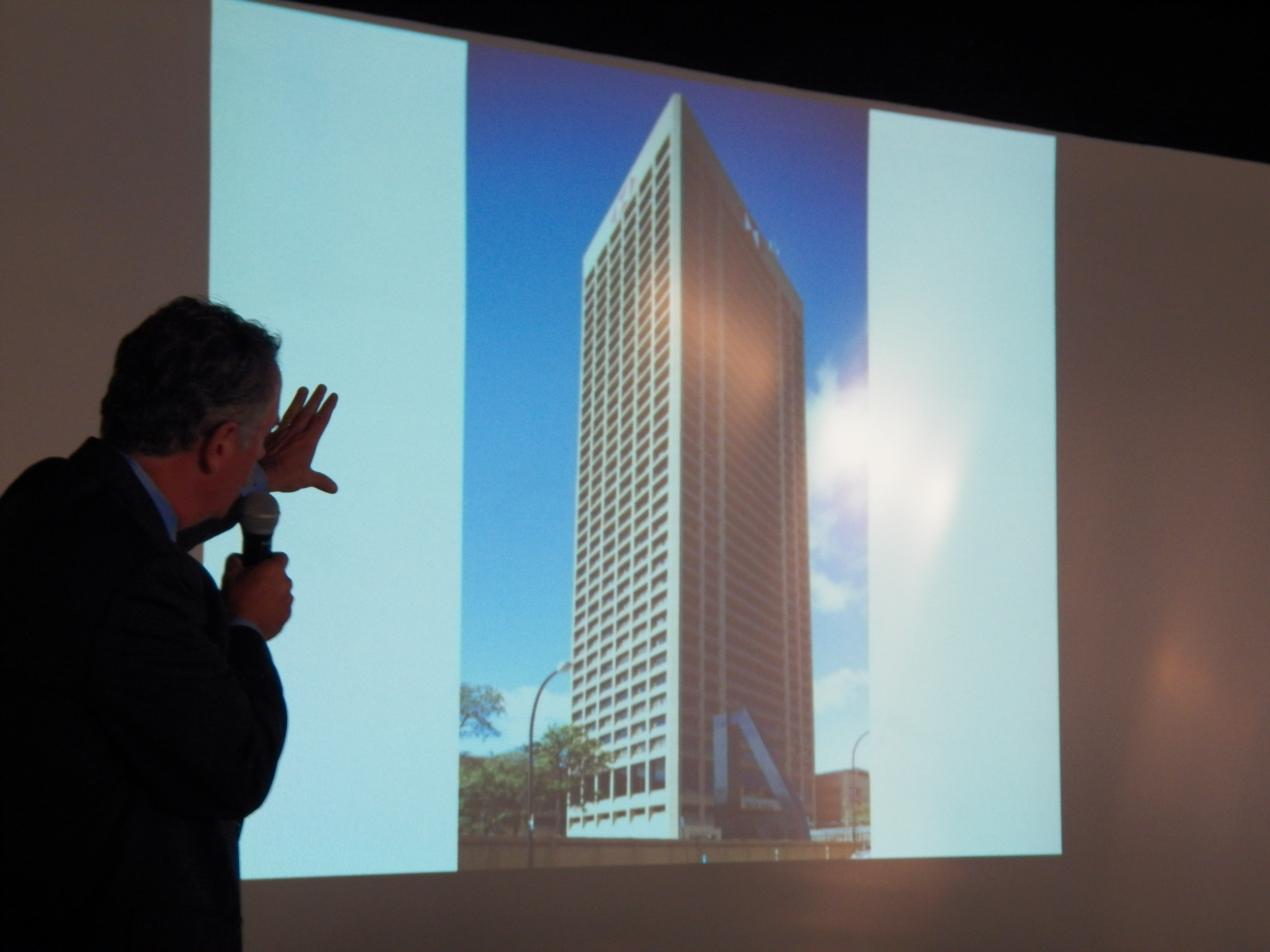 - Person holding a microphone, standing in front of a screen
