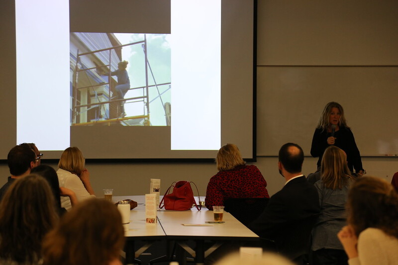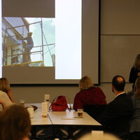 People seated at tables looking at a screen at the front of the room.