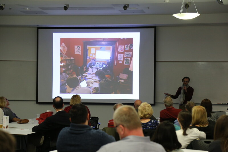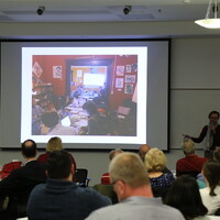 People seated at tables looking at a screen and a person presenting at the front of the room.