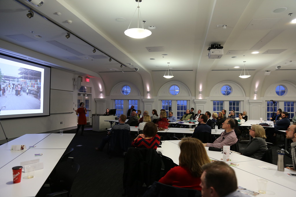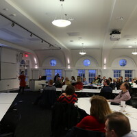 People seated at tables looking at a screen and a person presenting at the front of the room.