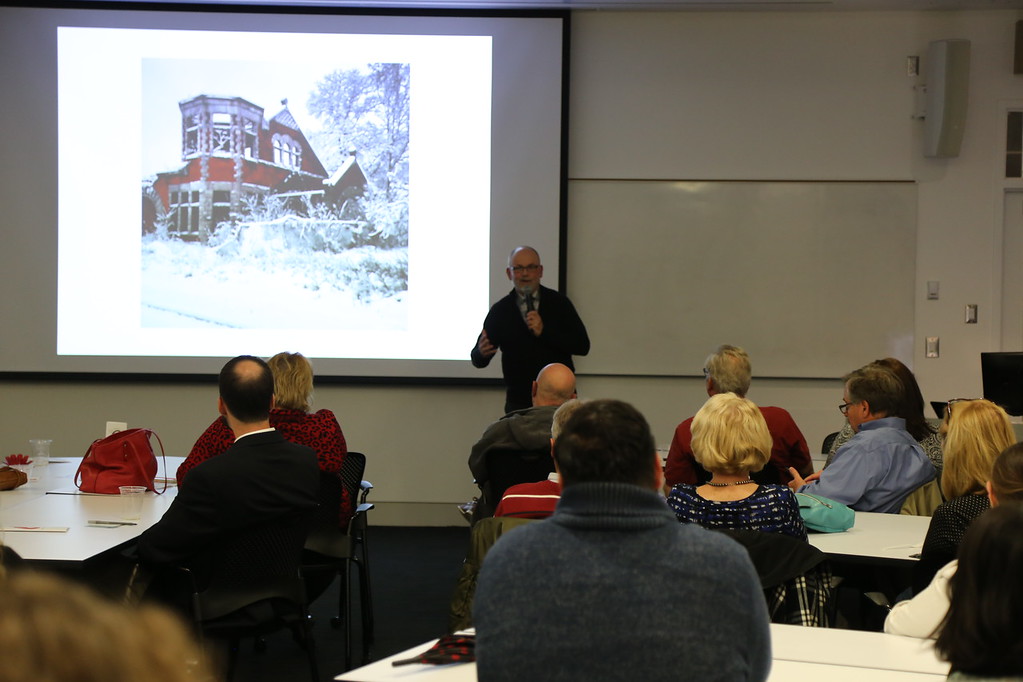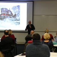 People seated at tables looking at a screen and a person presenting at the front of the room.