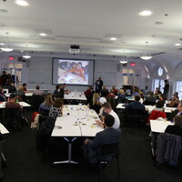 People seated at tables looking at a screen and a person presenting at the front of the room.