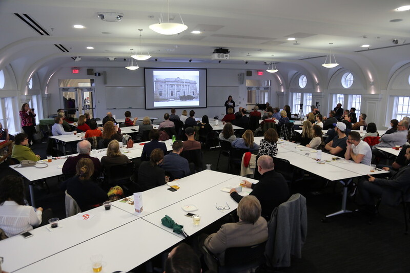 People seated at tables looking at a screen at the front of the room.