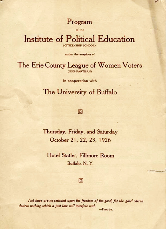 - Full program of events and speakers at the Institute of Political Education held under the auspices of the Erie County League of Women Voters in cooperation with the University of Buffalo on October 21, 22, 23, 1926 at the Hotel Statler, Buffalo, New York. Political Institutes were conducted by the League of Women Voters in conjunction with the University of Buffalo to fulfill the League's mission to educate citizens in government and politics and were, therefore, open to the general public as well as to League members.