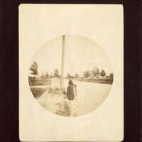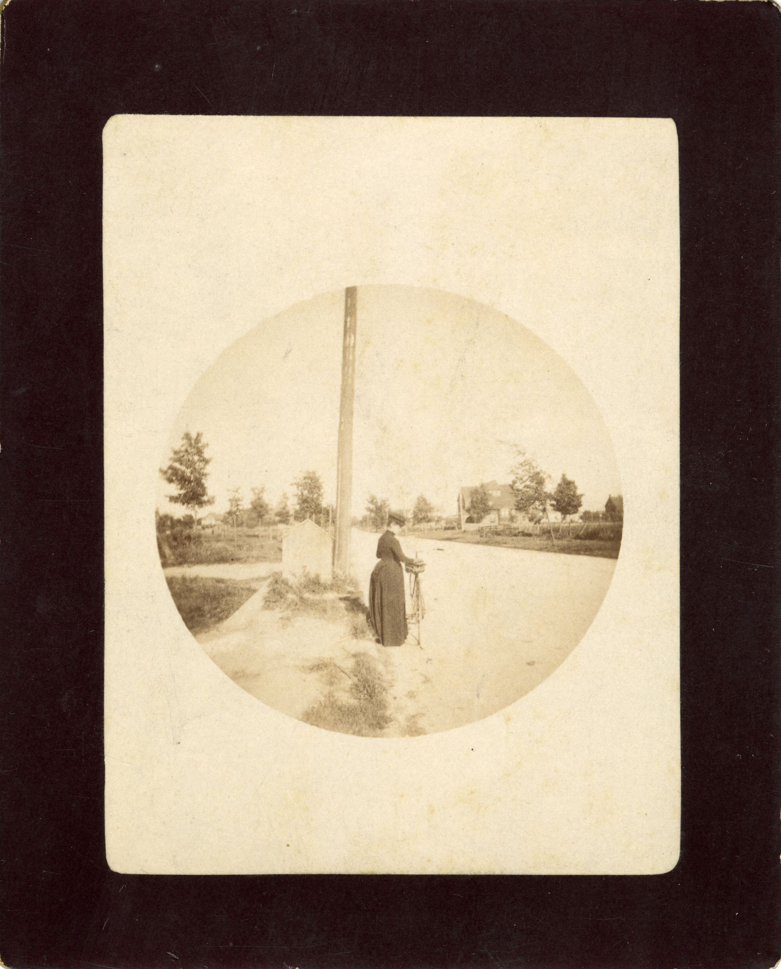 - Louise Bethune with Bicycle, black and white photograph, circa 1890-1910. Louise Bethune is pictured standing next to a bicycle on the side of a country road.
