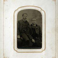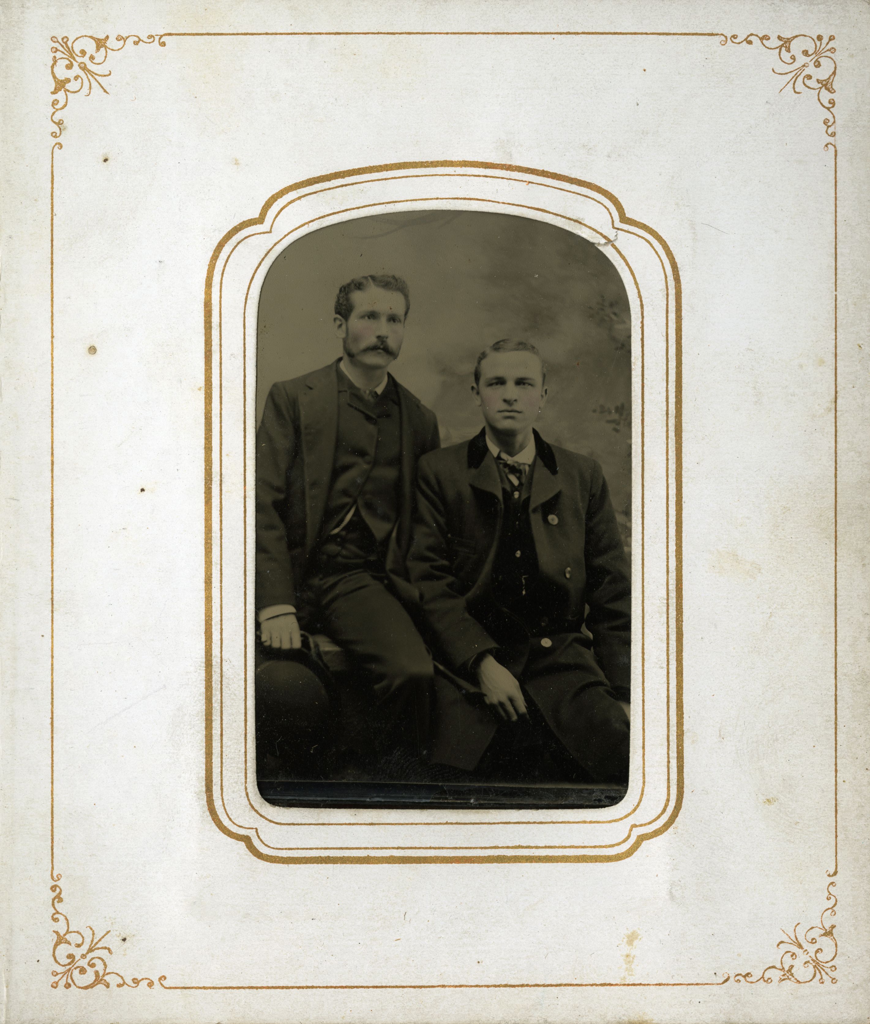 Black and white photograph of two men, seated. Page 5 of a tintype and cabinet card album, circa 1875.